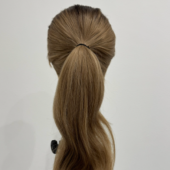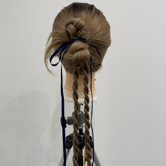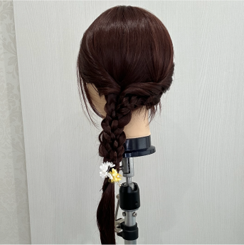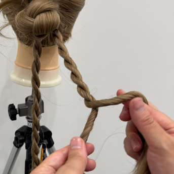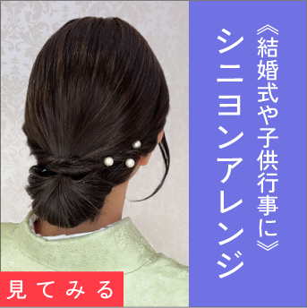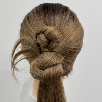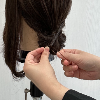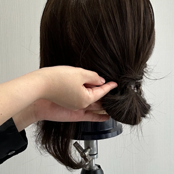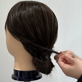 残しておいた前側の毛を、ねじねじして、シニヨンの上を通し、ヘアゴムで結びます。