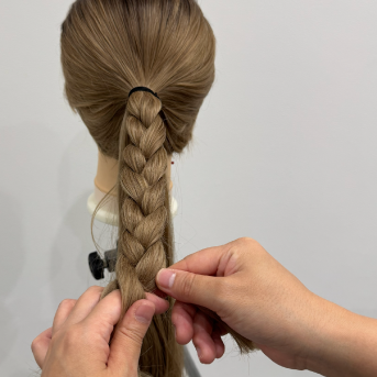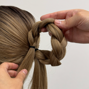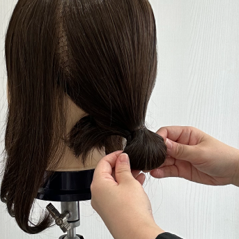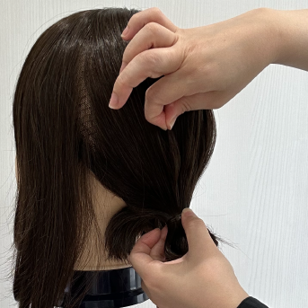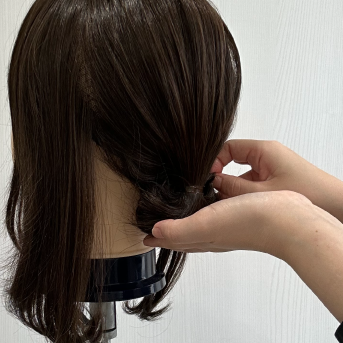 ヘアゴムの結び目を合わせて、お団子を結びます。※毛先を残すのがポイント