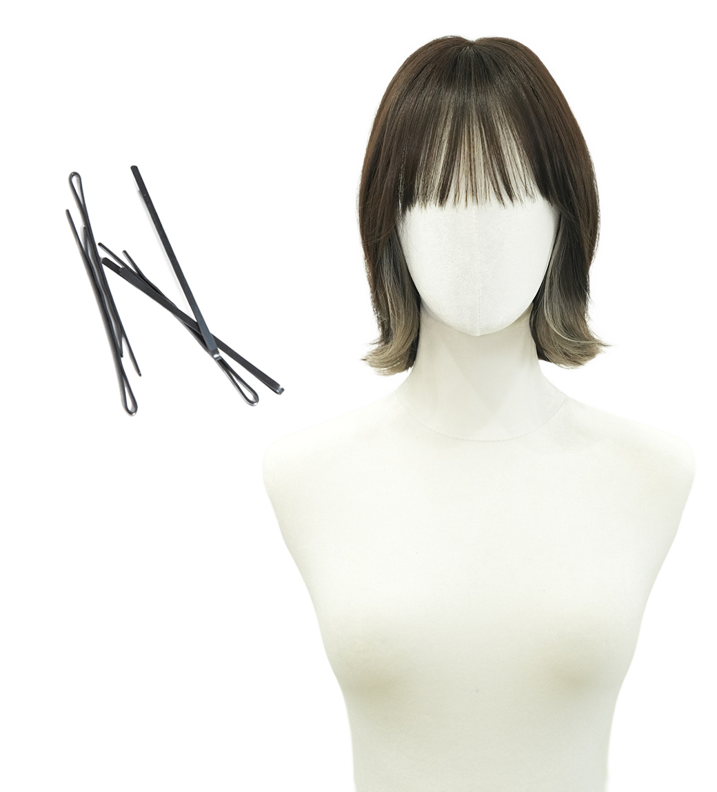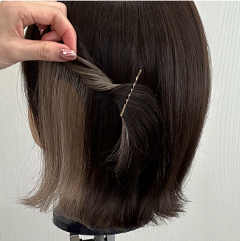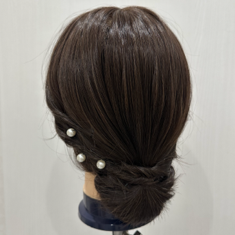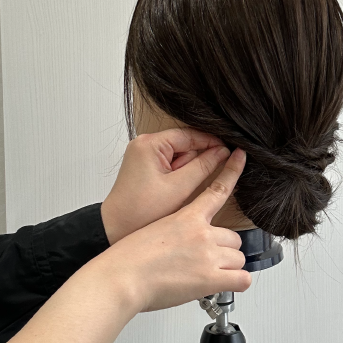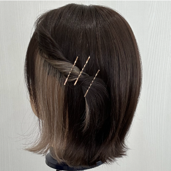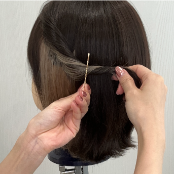 作ったお団子を軽くつぶしながら、ヘアピンで留めます。※反対側も同じように留める