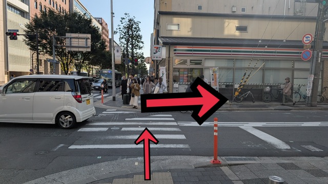⑦セブンイレブン側に信号を渡ってから右に曲がります。