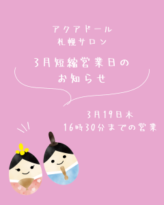 こんにちは アクアドール札幌サロンです ~3月の短縮営業のお知らせです~ 3/19(木)は社内研修のため 16:30までの短縮営業とさせていただきます。 最終受付 ・ウィッグご試着 15:00…
