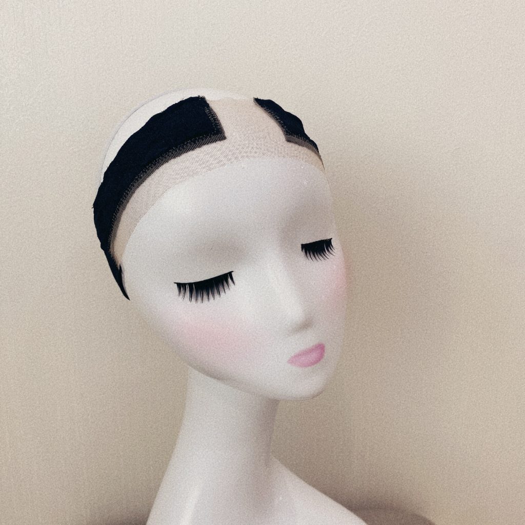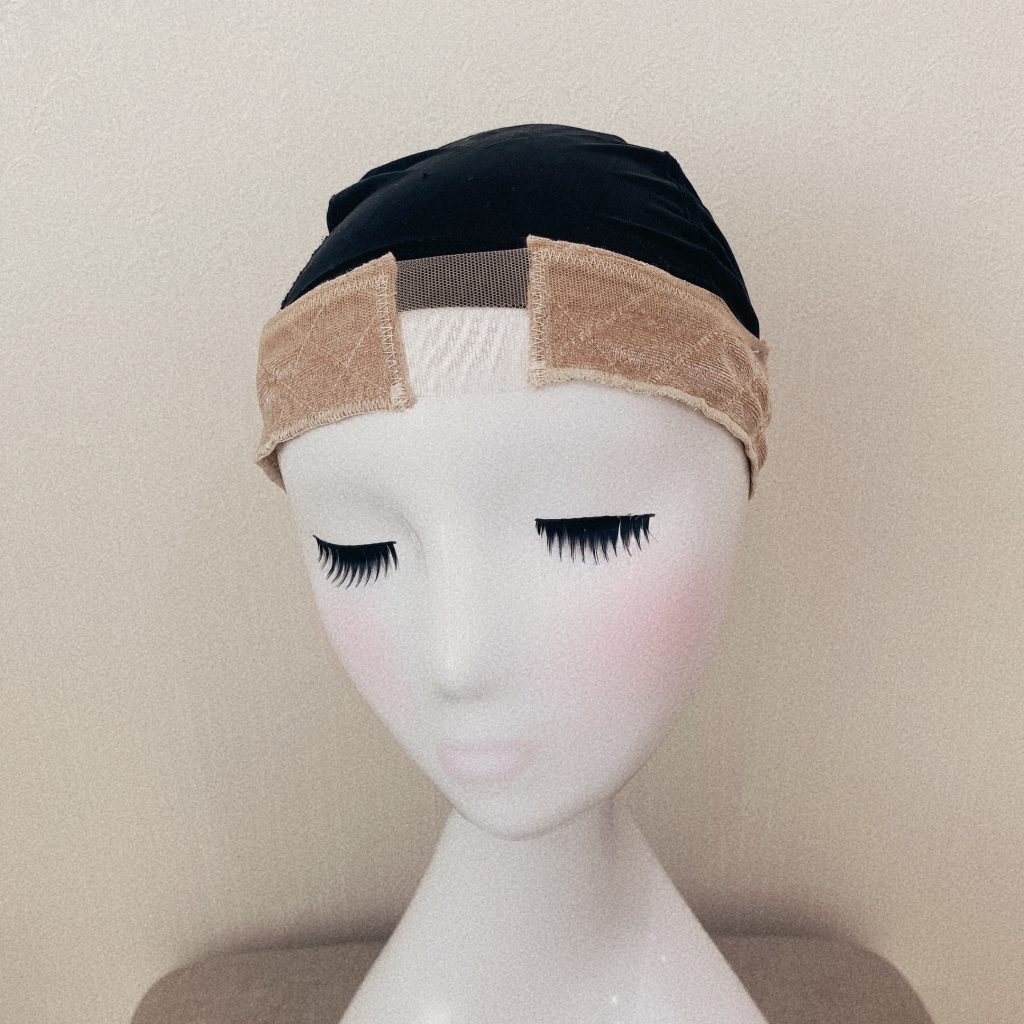 髪がある方はうしろで結び土台をつくりキャップの中にいれる